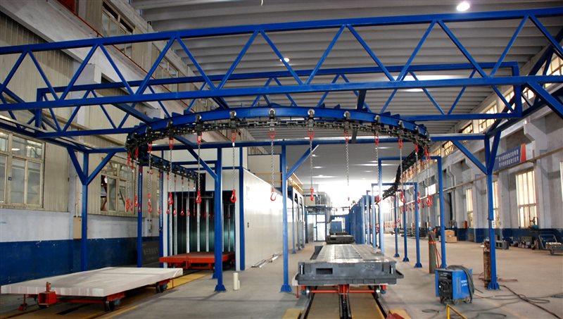 項目采用德國進口靜電噴槍,電子自動調漆技術,電子配比準確無誤。生產線中,大件噴漆通過平臺車輸送,小件噴漆通過懸掛鏈輸送,大小件噴漆采用共線生產形式。交叉作業既能滿足小件懸掛噴漆作業,又能在小件不生產時,滿足大件噴漆作業;同時兩種工件都能在噴漆后采用烘干作業。